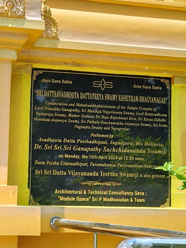 Sri Datta Avadhoota Temple, also called Sri Dattaavadhoota Dattatreya Kshetram also has Sri Marakata Karya Siddhi Anjaneya Swamy Temple and Sri Pathala Panchamukha Anjaneya Swamy temple is located in Dundigal on the outskirts of Hyderabad. It is one of the 16 Datta Shrines also called Shodasha Datta Kshetras representing the sixteen manifestations of Sri Dattaatreya Swamy in different parts of India consecrated by Sri Ganapathy Sachchidananda Swamiji of Mysore. The consecration and Mahakumbhabhishekam of the new Temple complex was performed on 15th April, 2024 by by Sri Ganapathy Sachchidananda Swamiji.